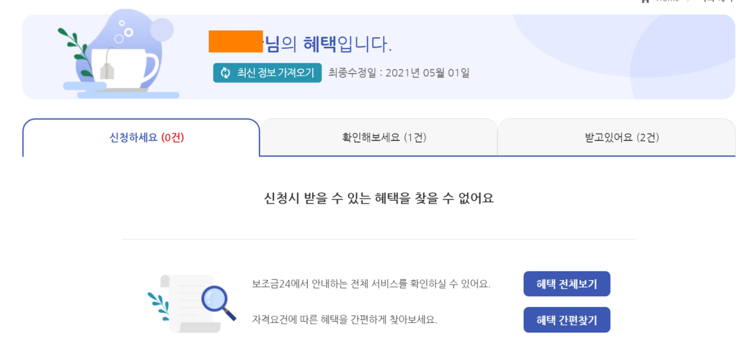 - 받고있어요: 현재 받고 있는 정부혜택은 이곳에서 확인이 가능합니다.