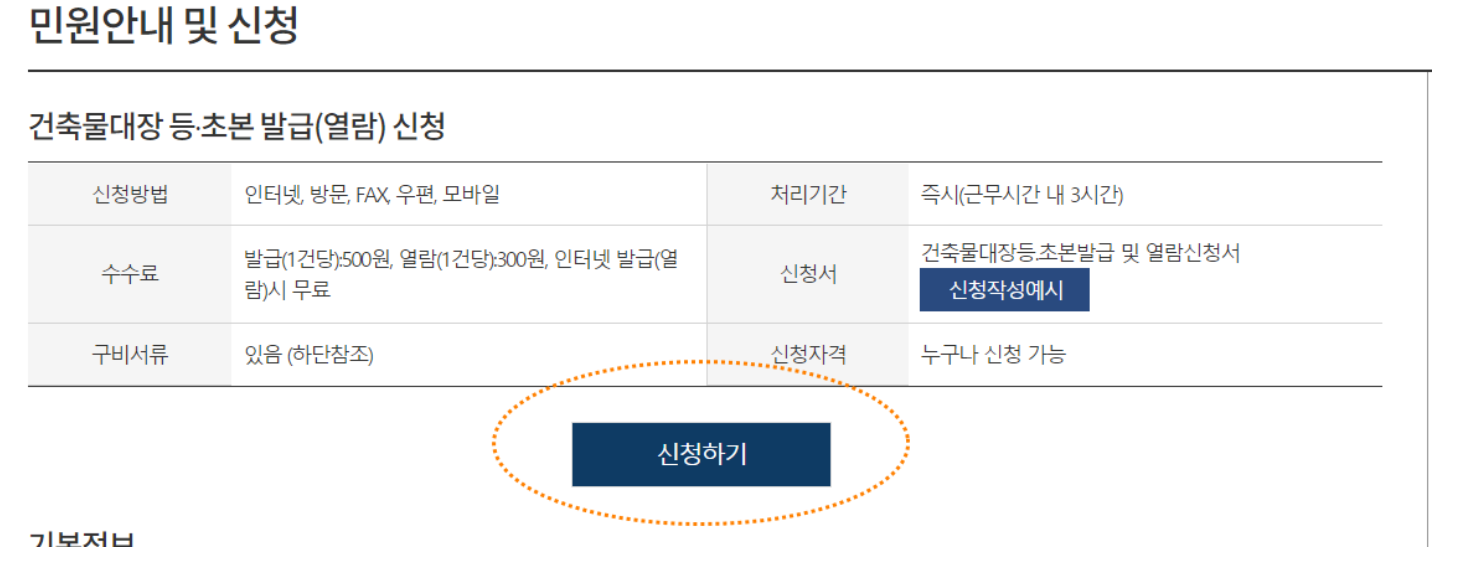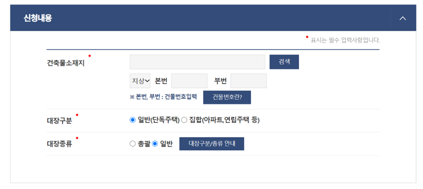5. 아래 해당 건축물소재지, 대장구분과 종류 등을 선택한 후 민원신청하기를 눌러주시면 열람이 가능합니다.