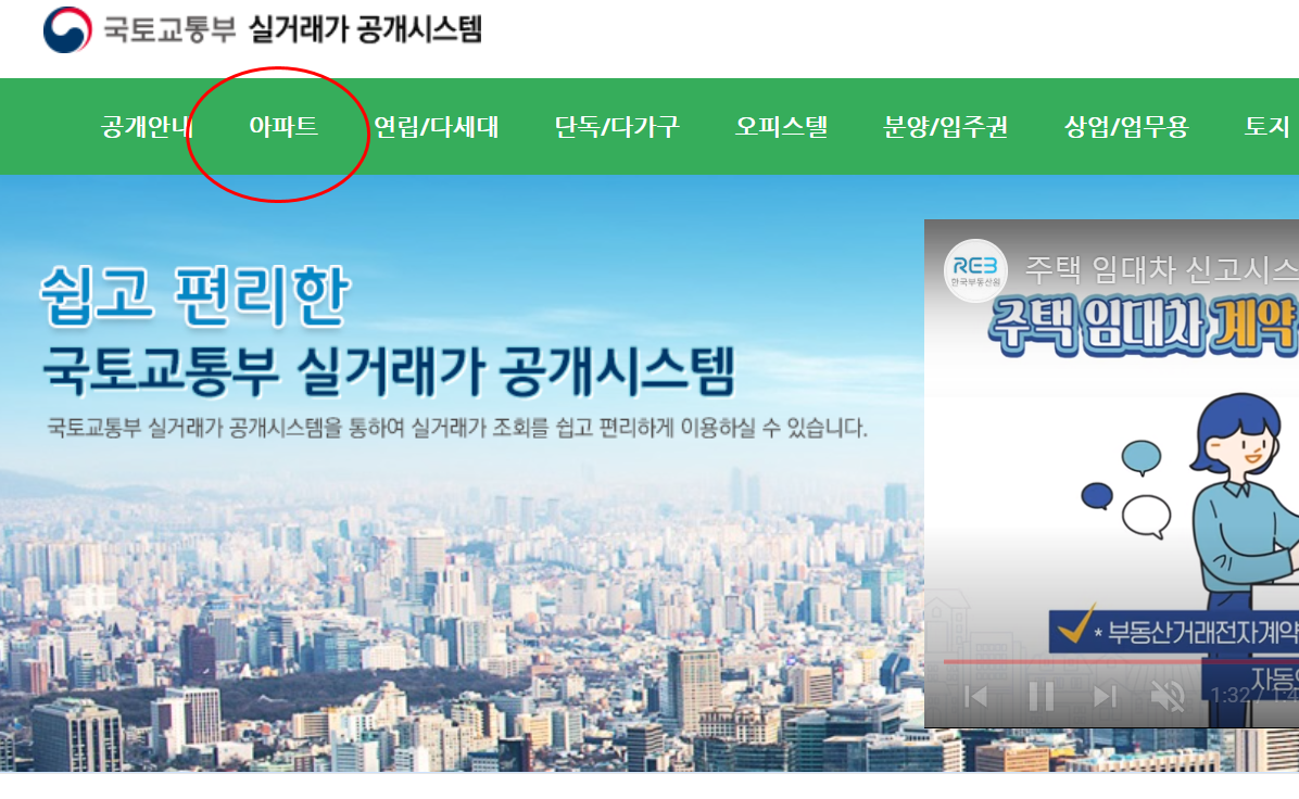 2. 상단메뉴의 '아파트'를 클릭해 들어가주세요.