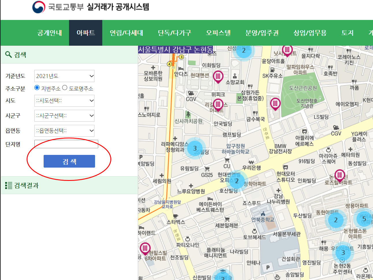 3. 왼쪽 주소창에 원하는 아파트 주소지를 입력 후 검색을 클릭합니다.