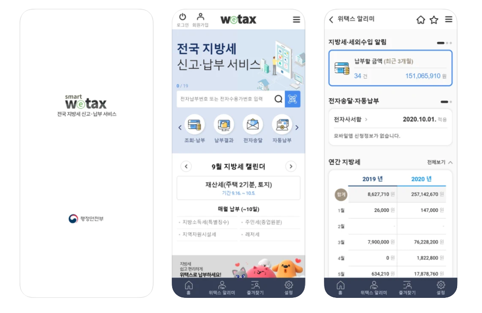 컴퓨터로 위택스 홈페이지에 접속하는 방법도 있지만 스마트폰 어플을 통해서도 조회, 납부 등의 서비스를 이용할 수 있습니다. 모바일 앱으로 전국 모든 지방자치단체의 지방세 관련 업무를 볼 수 있으니 매우 편리한데요.