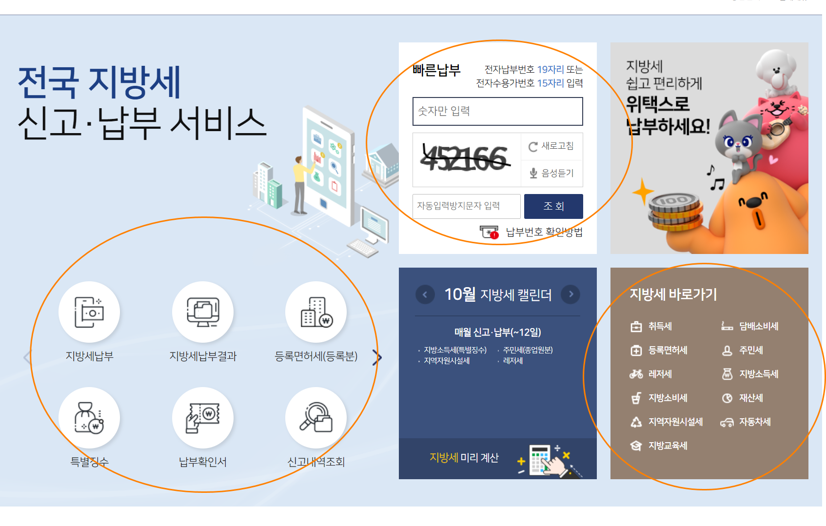 상단메뉴 대부분의 서비스는 메인화면에서 처리가 가능합니다. 지방세납부, 결과, 조회, 지방세 바로가기 등을 이용해보세요. 메인화면에서 원하는 서비스를 찾기 못한다면 위에서 언급한 4개의 메뉴 안에 있으니 참고하시기 바랍니다.