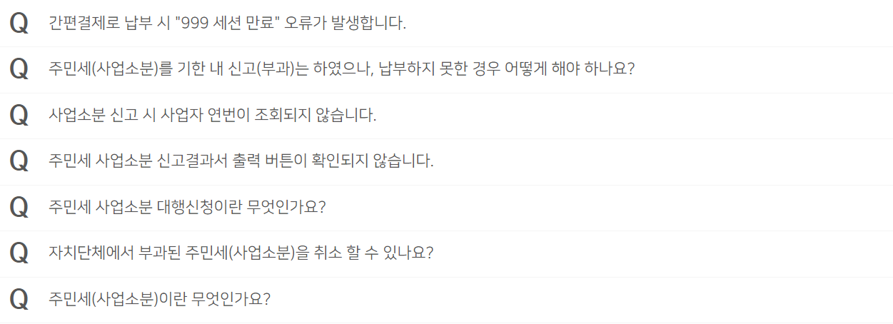 세금 관련 업무 처리를 하다보면 궁금한 점이나 오류사항도 종종 발생합니다. 이는 홈페이지 내 자주 묻는 질문 게시판을 이용하시면 큰 도움이 됩니다. 아래 링크를 클릭하면 해당 페이지로 이동하니, 궁금하거나 문제가 되는 단어를 검색해 답변을 찾아보시기 바랍니다.
