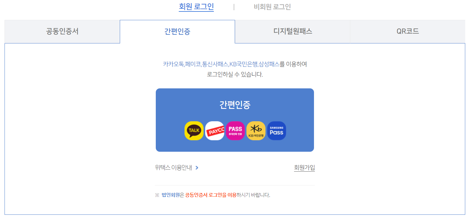 2. 로그인 화면이 나옵니다. 공동인증서(구 공인인증서), 카카오톡, 페이코, 국민은행, 삼성패스 등을 통해 인증을 진행하시면 됩니다.