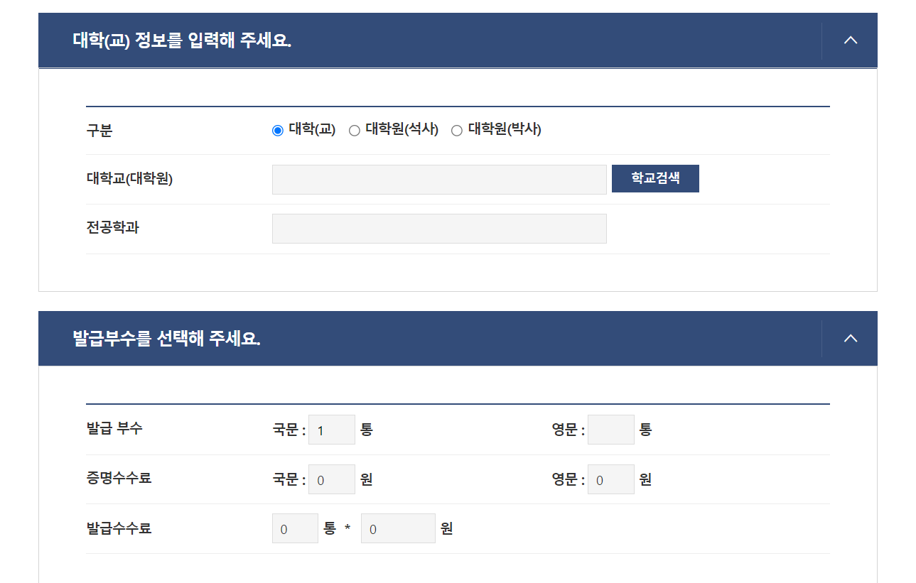 4. 학교 검색 후 아래 발급부수, 수령기관 등을 선택 후 민원신청하기를 누르면 완료!