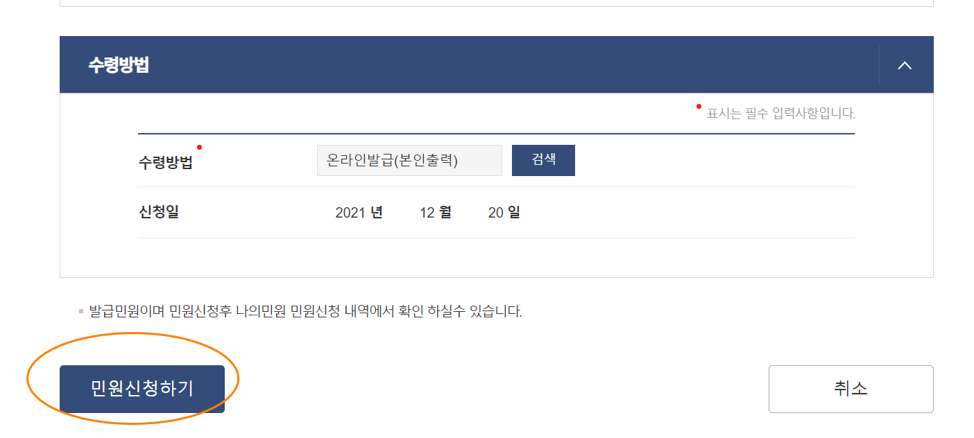 3. 신청 페이지 내 항목을 정확히 기입 후 아래 민원신청하기를 누르면 완료!